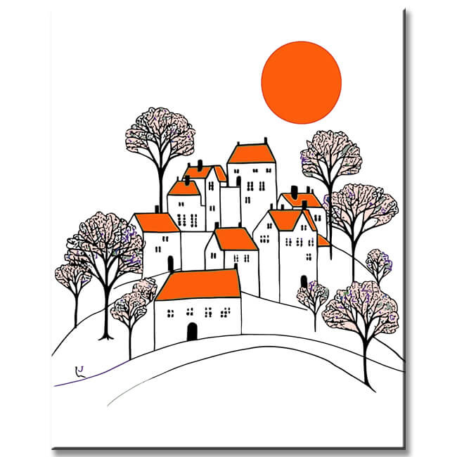 Malen nach Zahlen Kunst Illustration weiße Häuser mit orangenem Dach und schwarze Bäume