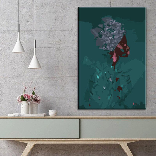 Malen nach Zahlen Kunst Lifestyle Afrikanische Frau mit Blätter Umhang und rosa Ohrringen