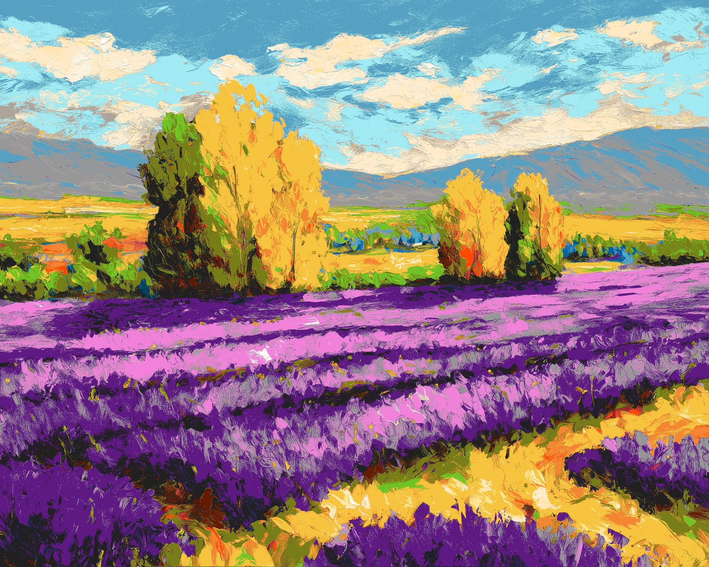 Grind to Zahlen Blumen Lavendelfeld vor Dorf
