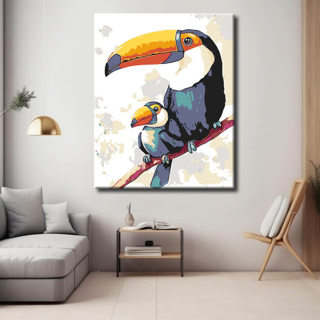 Malen nach Zahlen Kunst Tier Tukan hat Tukanbaby auf dem Schnabel
